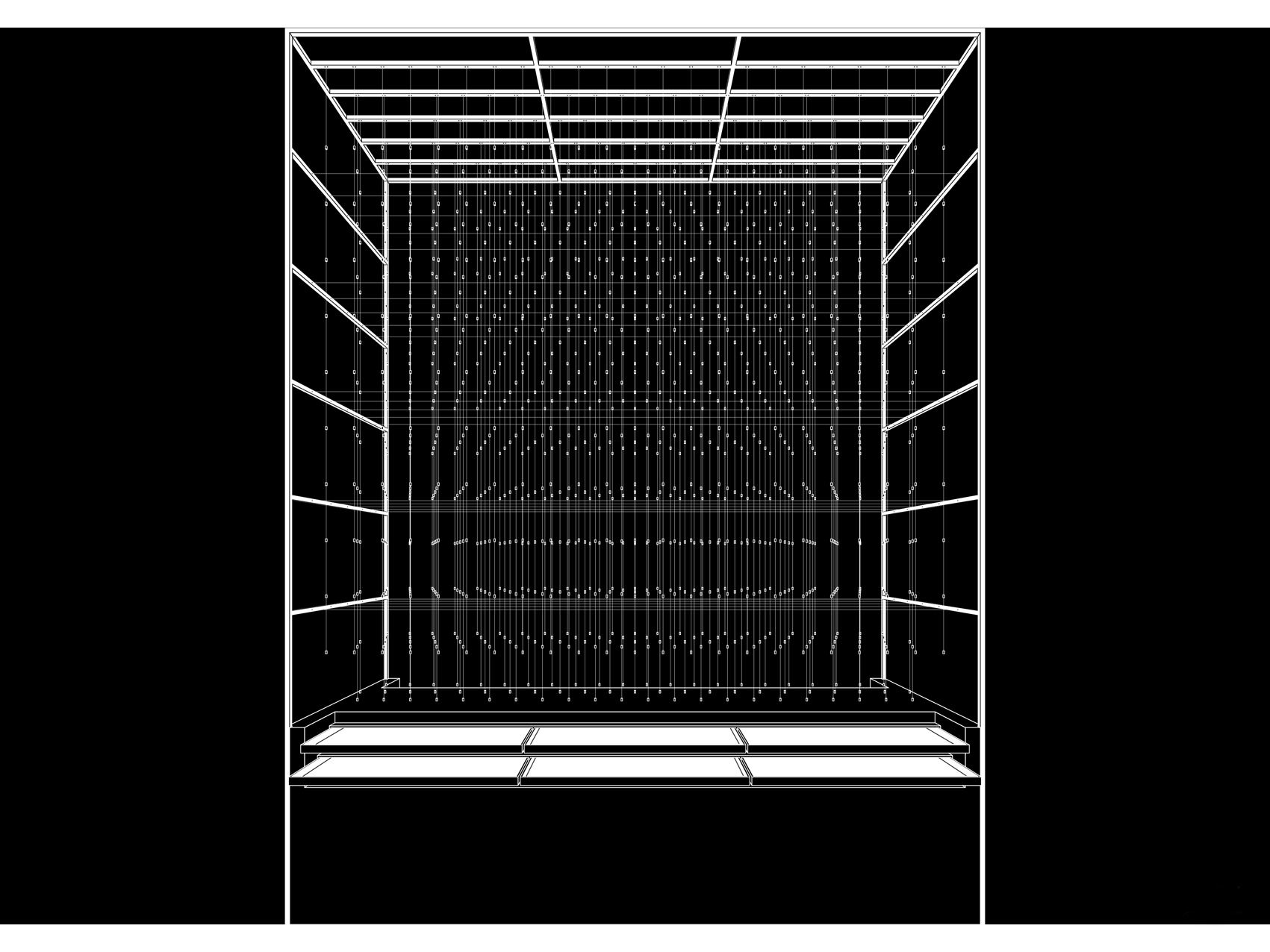 Going upward with the eyes, visitors discover a network of 1,3 kilometres of nylon thread hung on a white steel structure made of 25 mm of section. This elaborate temporary structure, with very clear geometry, creates a network of 1850 nodes, each marked by a steel cylinder bolt. As a theatrical reminder of ephemeral projects such as the cinema screenings at Basilica di Massenzio, a multitude of 1000 seated man in scale 1:87 inhabit the structure. Men, women, and children, all with different backgrounds, seating together on the bolts. The white structure also frames and encloses the Arsenale’s column that is highlighted by the change of scale produced by the proximity to the 1:87 men.
